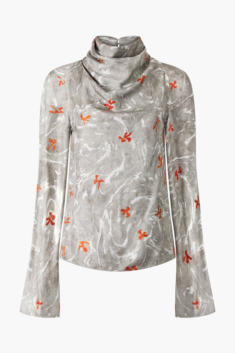 The Cara top is cut in Italy from luxurious silk patterned with a marbled floral print. It's designed with a button fastening high-neck that elegantly drapes, and then finished with long bell sleeves.