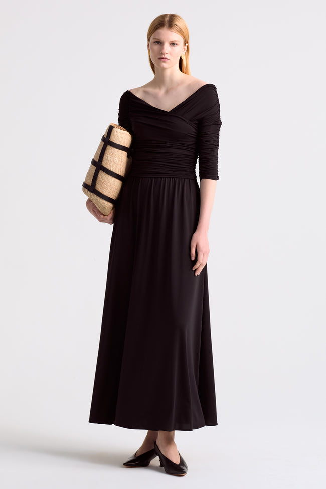 The Char dress is an easy style that can be worn from work to weekend. Cut in Portugal, it's designed with a flattering ruched bodice, half sleeves and then falls to a long, flowing hemline.