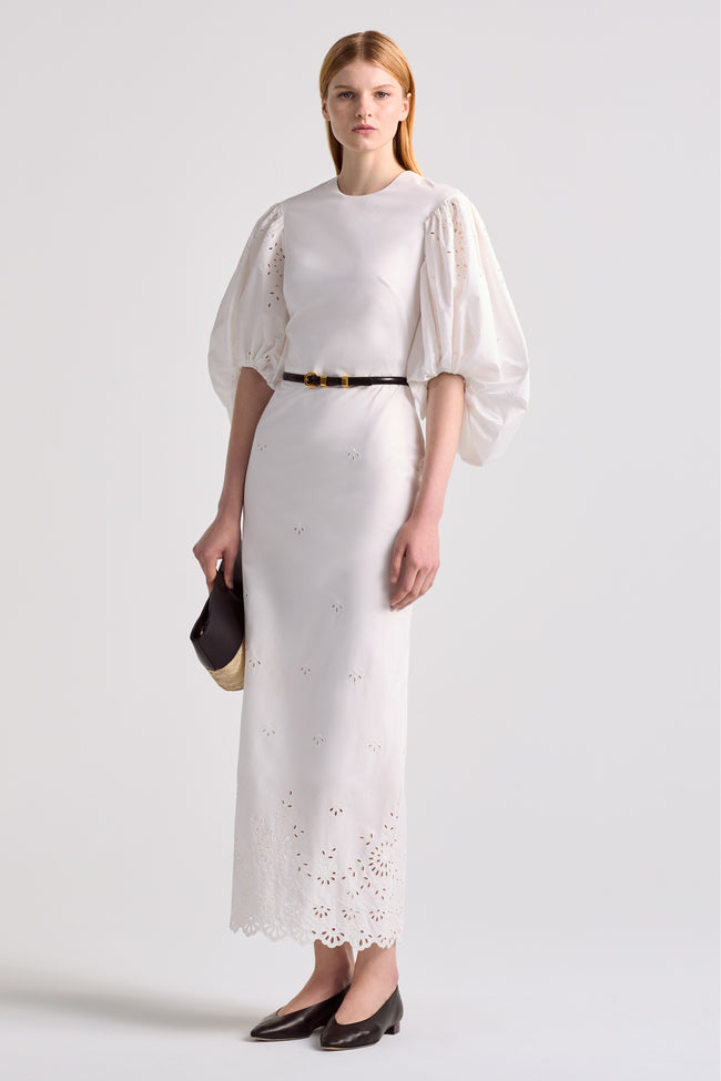 The Danielle midi dress is designed with dramatic transparent sleeves that billow elegantly. Made in Italy from silk-cady in an optic white shade, it's cut for a figure-hugging silhouette and has a round neckline.
