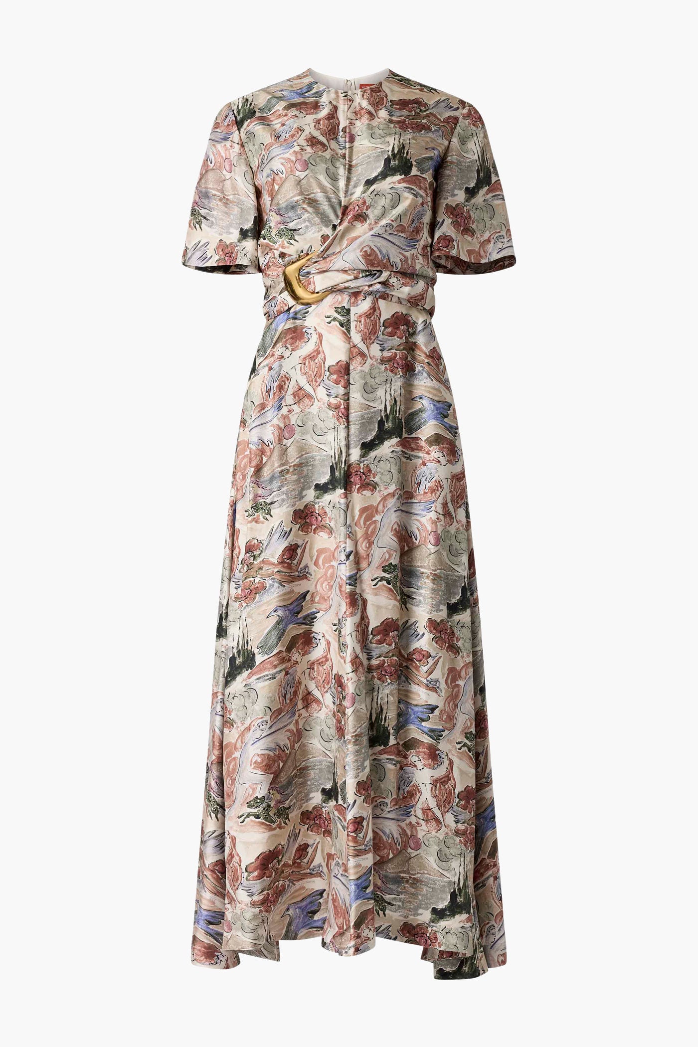 The Honey dress is cut in Italy from a lightweight silk featuring a mythical fawn print which was hand-drawn. Note the belt which is designed to wrap around the waist and is finished with an oversized buckle to cinch your shape.
