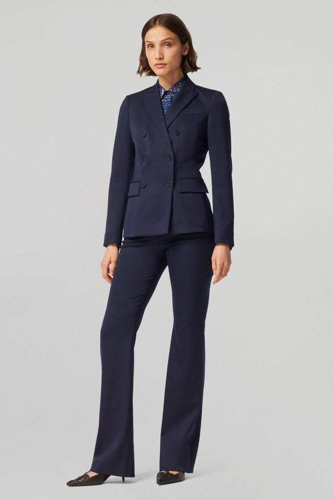 The Indiana Jacket is a signature style, tailored from virgin wool to a timeless double-breasted design with notched lapels. It falls to an elegant length just below the hip and it has two flap front pockets.