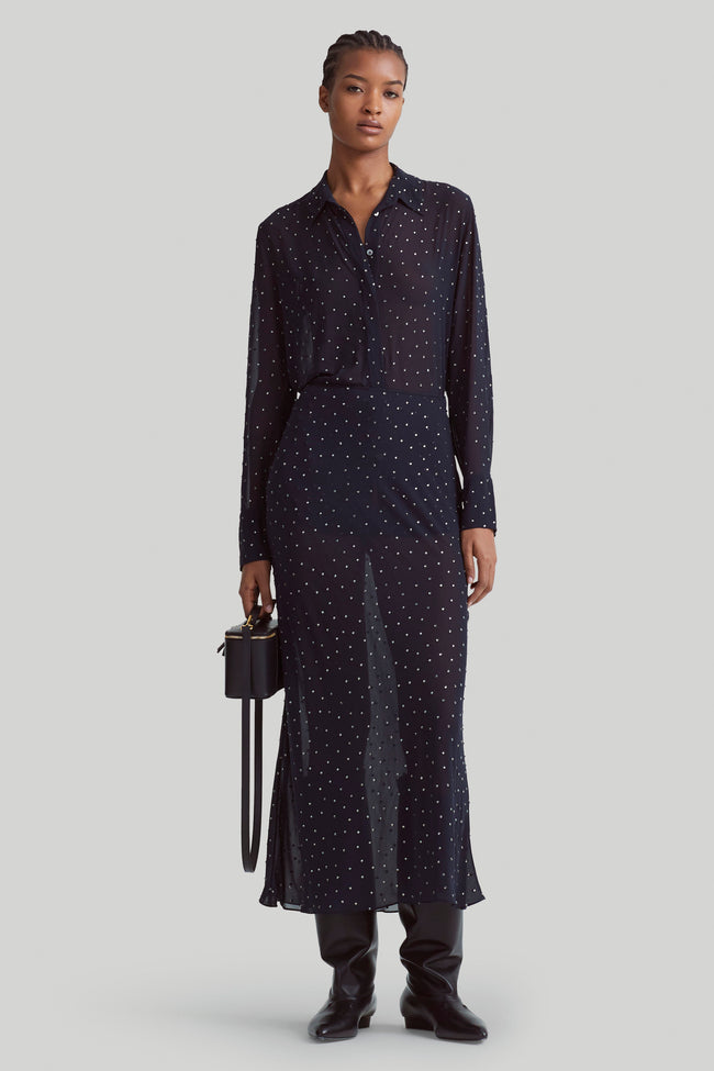 The Kinski skirt captures the sheer trend, shaped from transparent midnight blue chiffon. It's designed to fall to a maxi hemline that delicately flutters and is contrasted with metal studs throughout.