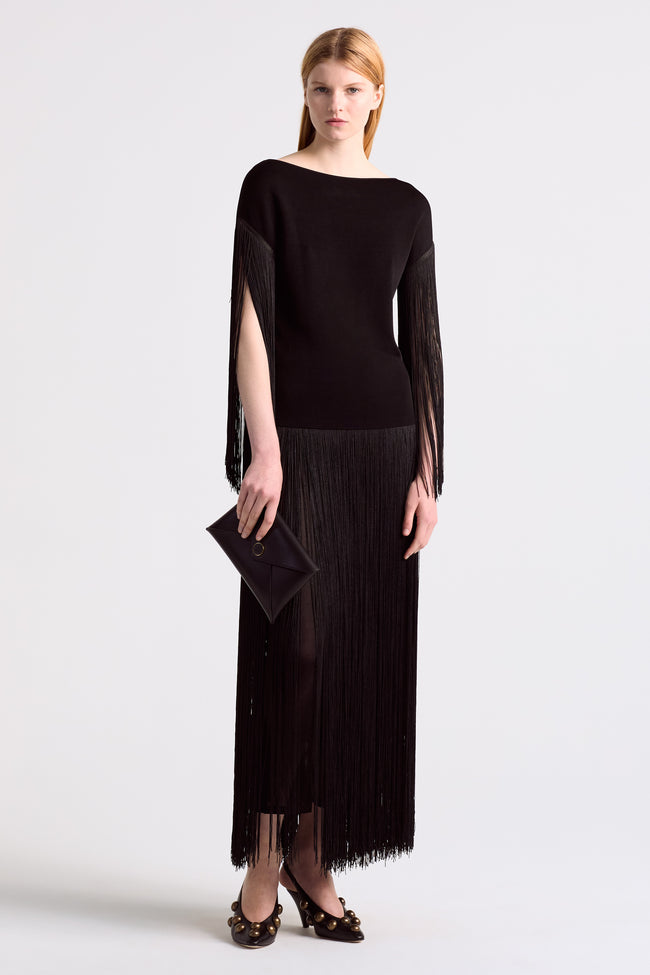 The May Top is made from a compact knit jersey, cut to a close-fitting silhouette. It's designed with a slash neckline, then elevated with long fringed sleeves that swishes with each step.