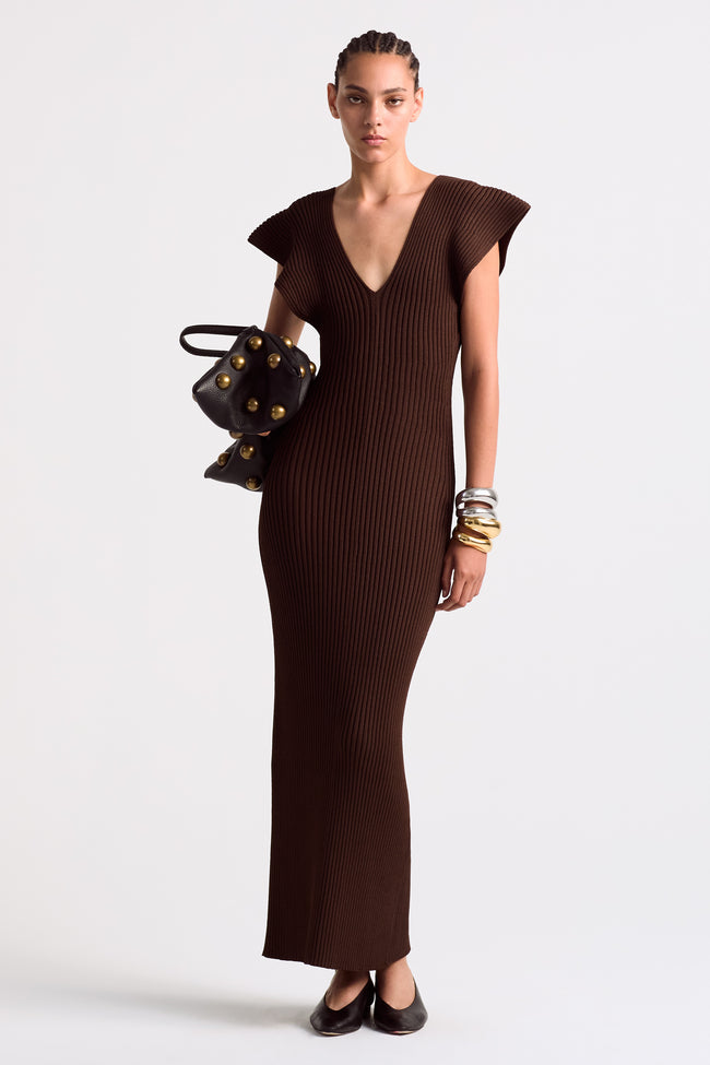 The Trey dress masters the art of day to night dressing. It's designed with a ribbed-knit finish to a close-fitting maxi silhouette, then detailed with a V-neck and ruffled short sleeves.
