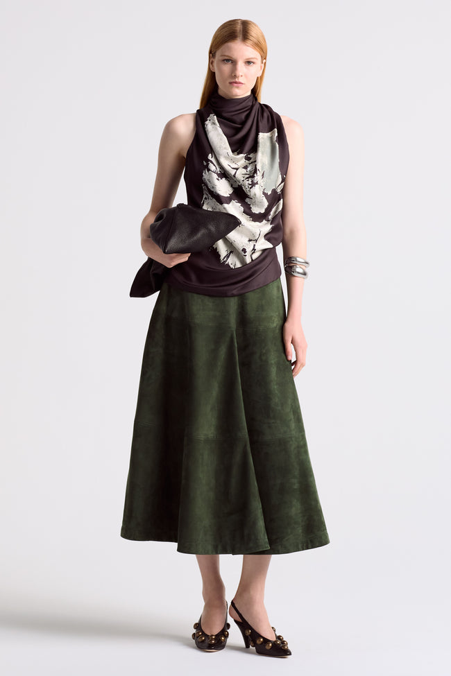The Varda skirt is made from panels of velvety suede in a rich dark green hue. The smooth A-line midi shape sits at the natural waistline and fastens at the back via a concealed zip.
